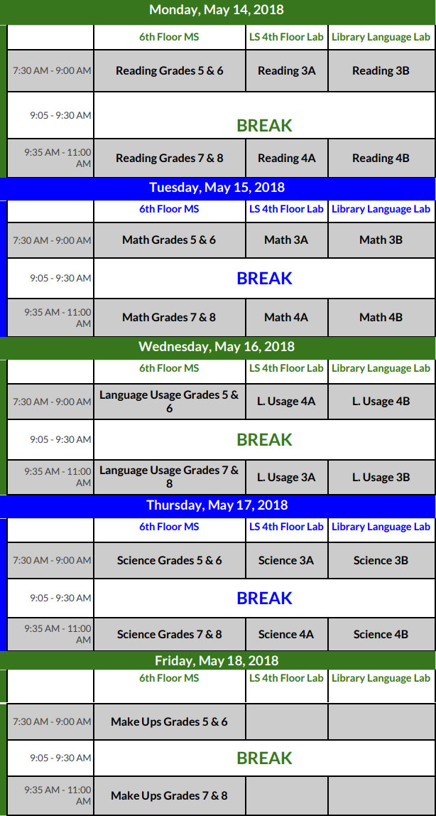 This semester our MS students will be administered the MAP tests in the areas of mathematics, reading, science and language usage from May 15 thru May 18. The school administers the test to determine our students instructional level and to measure academic growth compared to their test results that were administered in the fall of this school year. The testing schedule is as follows: